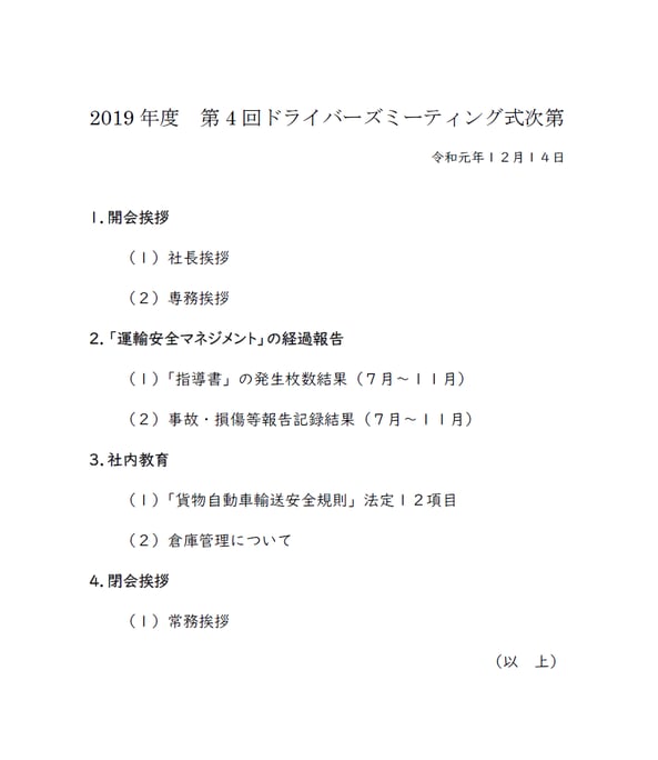 1部は、従業員のドライブマナーの向上等を目的としたドライバーズミーティングを実施し、2部は、従業員の相互間の親睦を深め、
